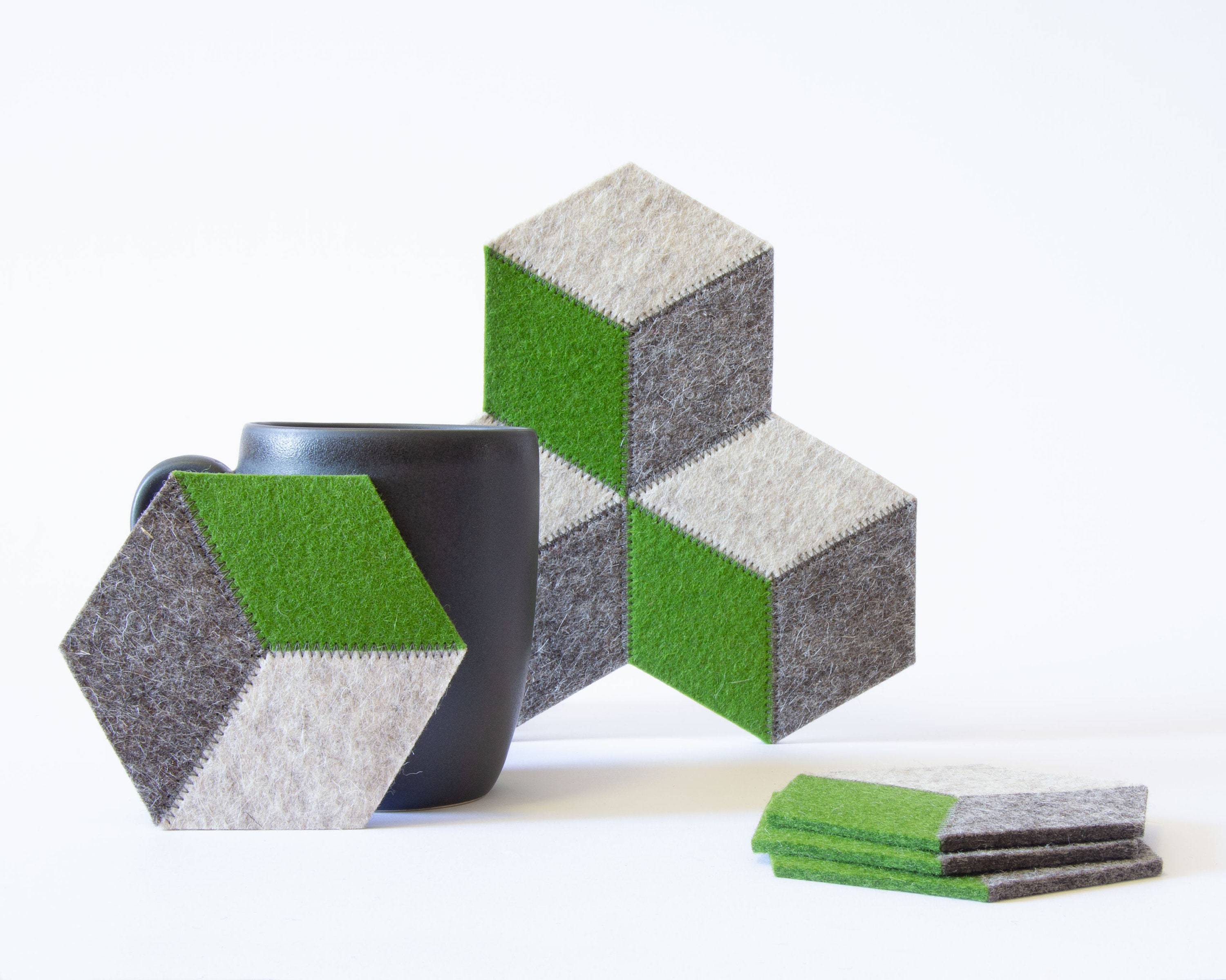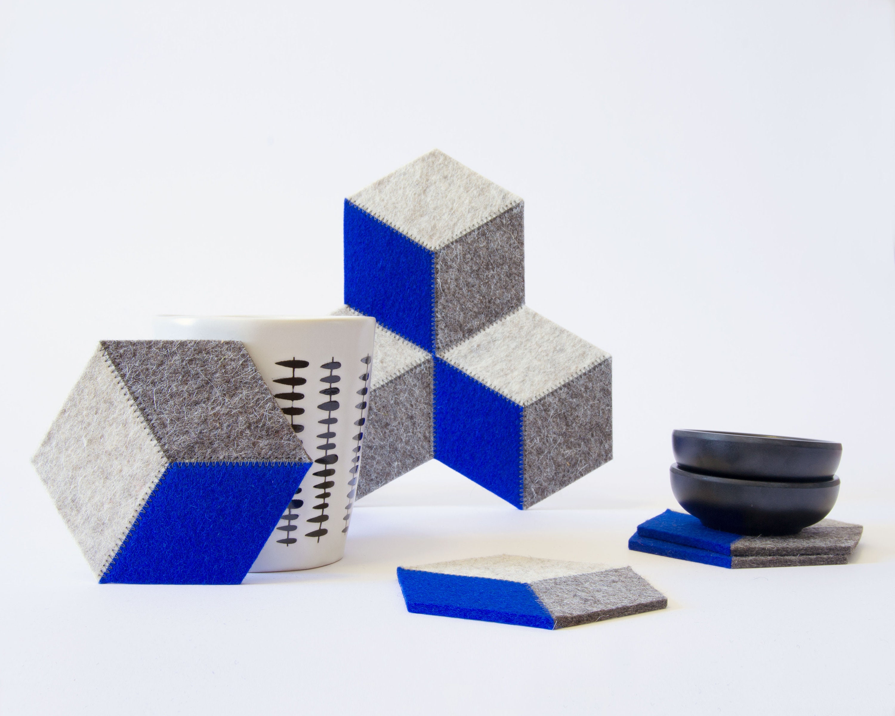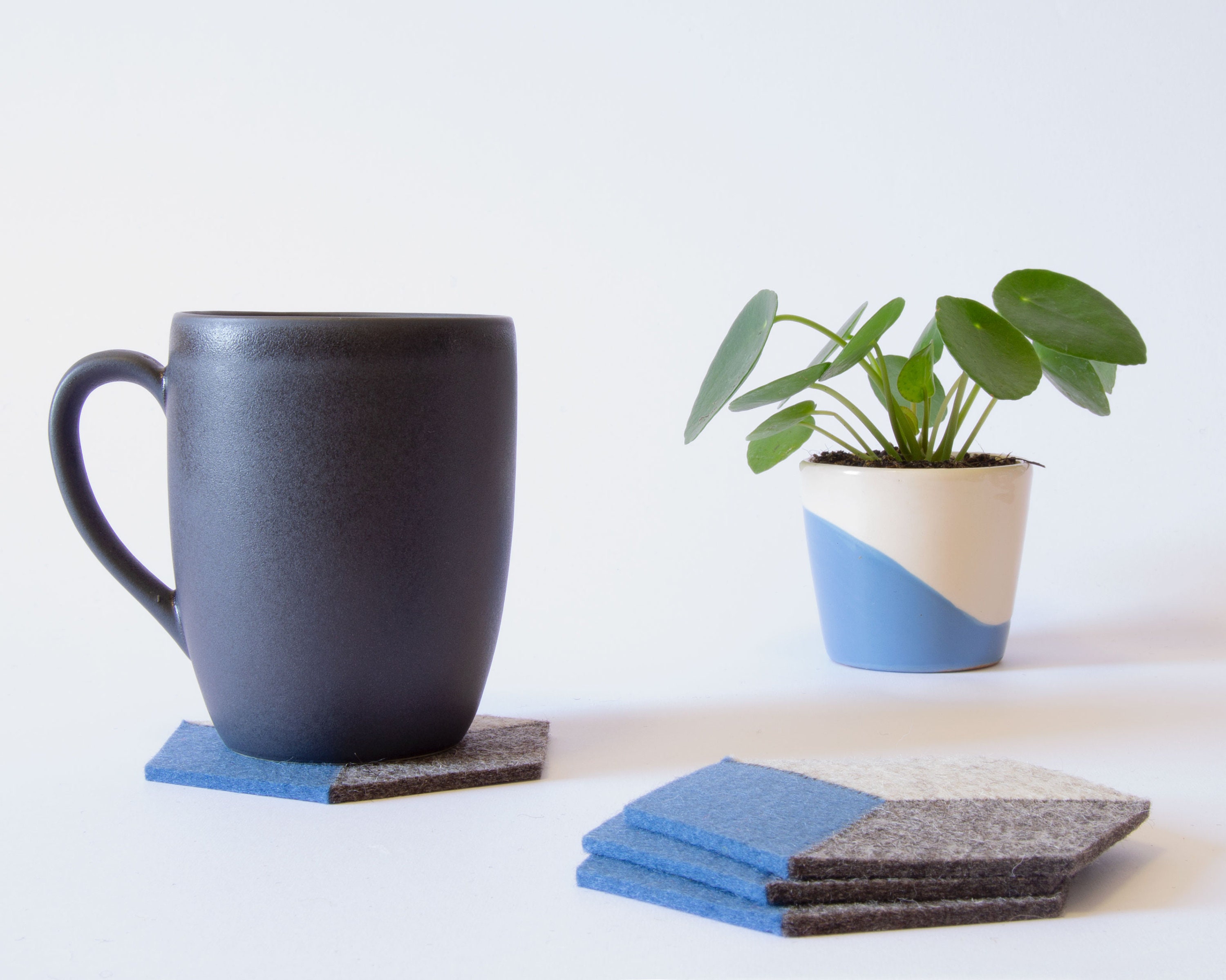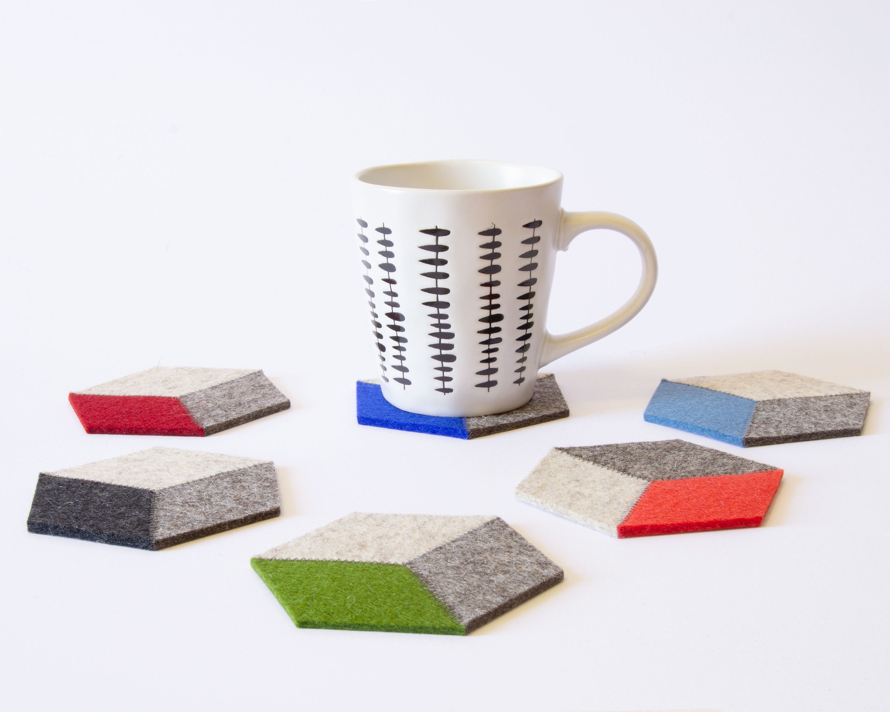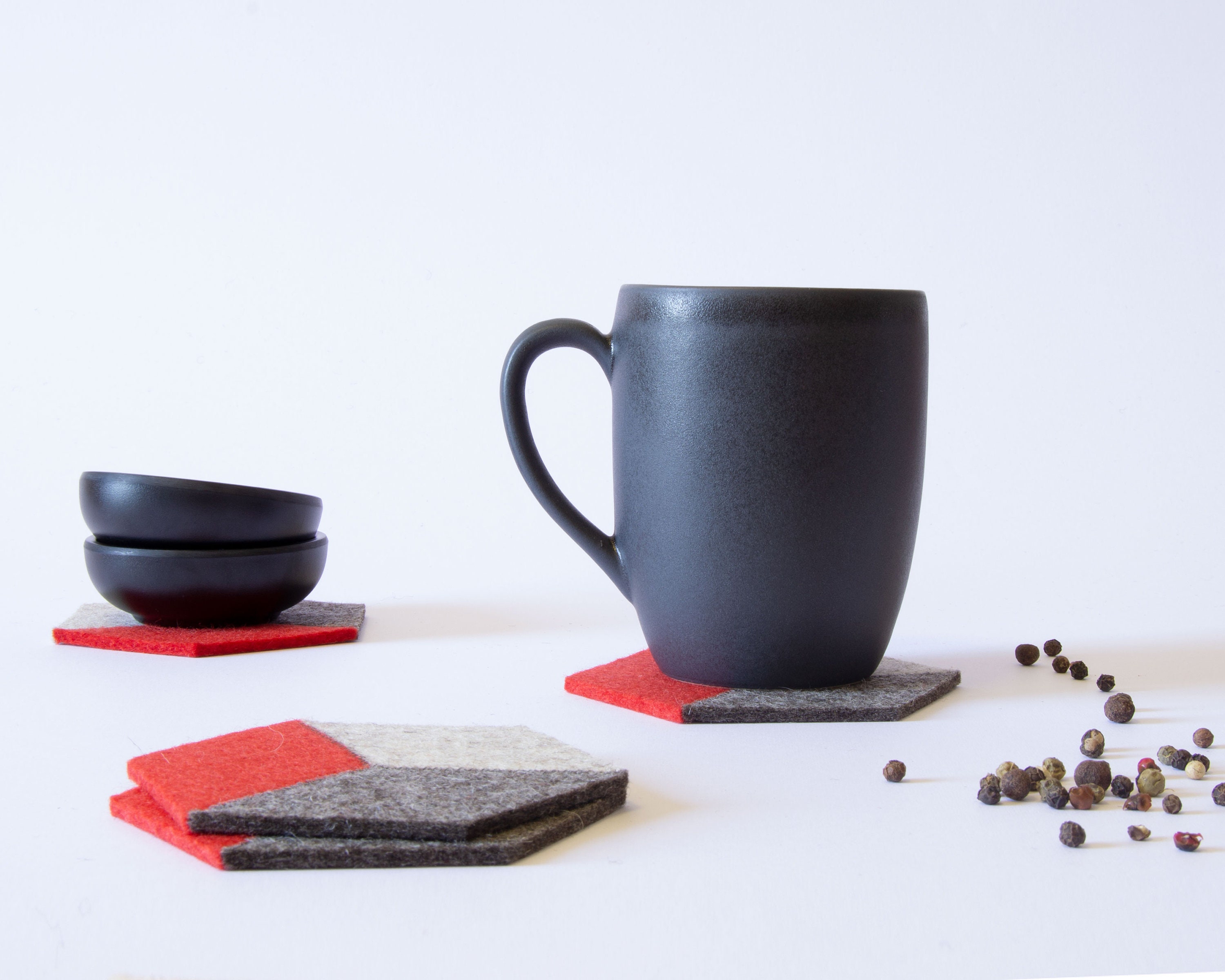 Protect your furniture in style with this set of felt coasters! They are made of 100% wool felt and have a minimalist and eye-catching design. You can add the trivet for your teapot or decanter.