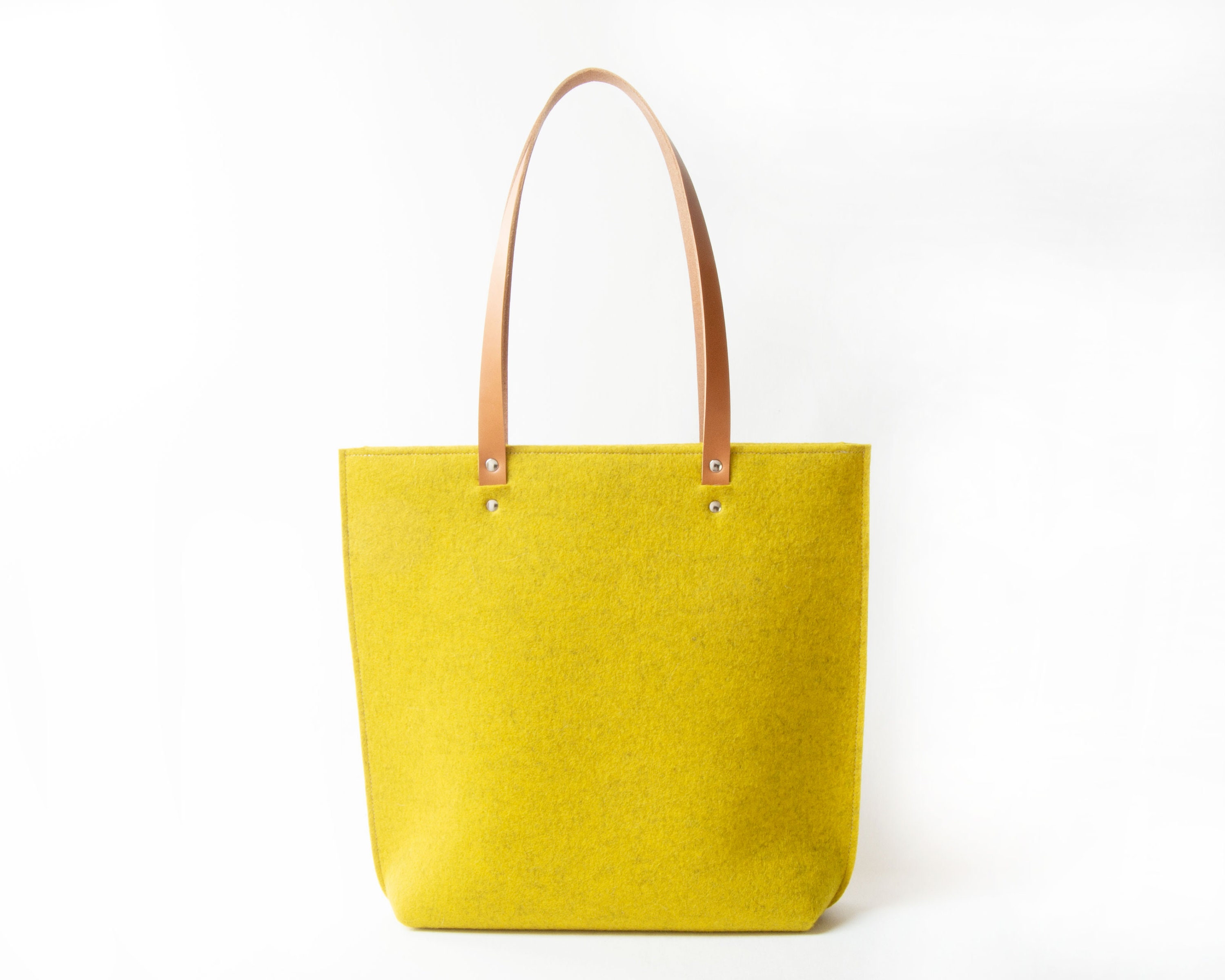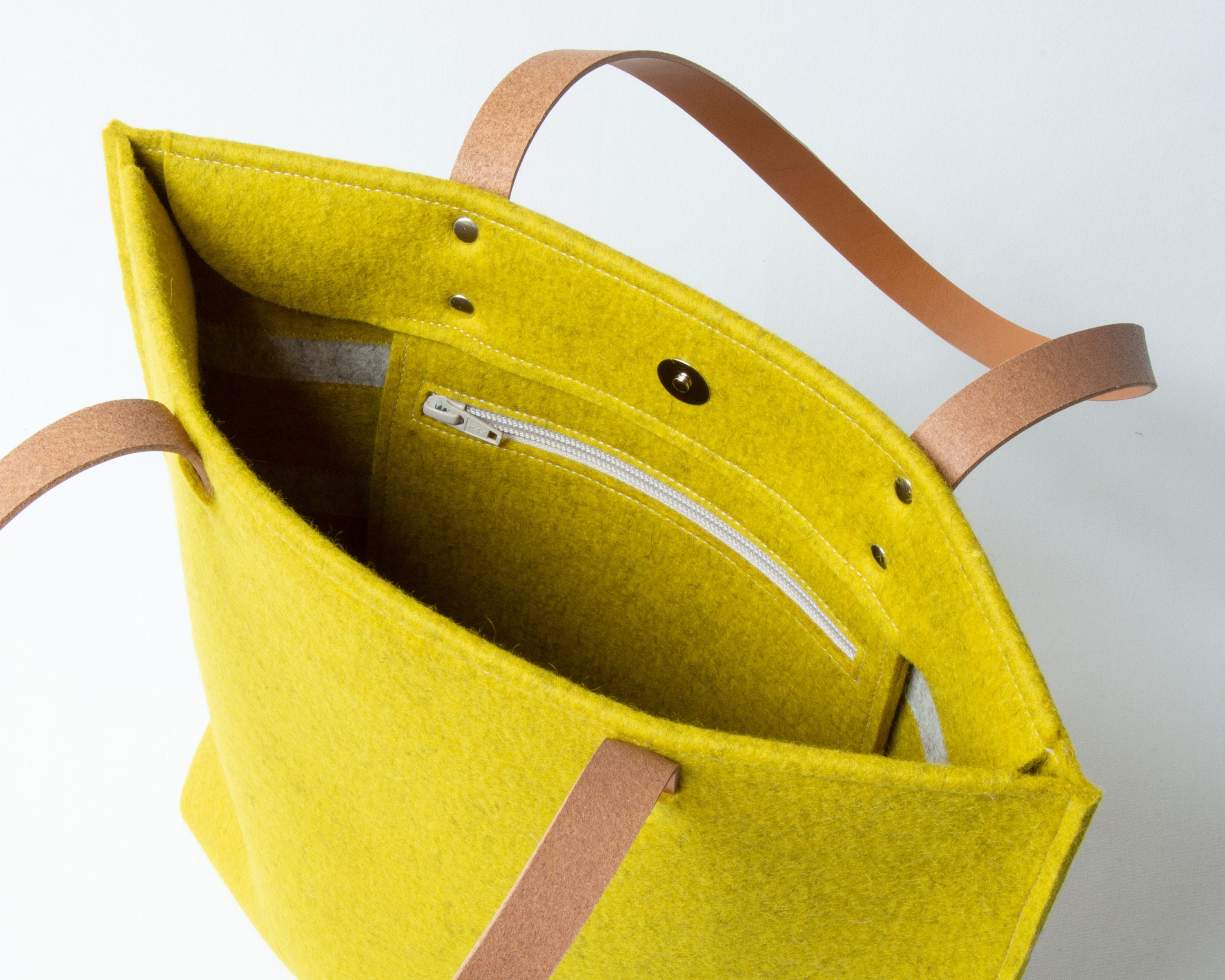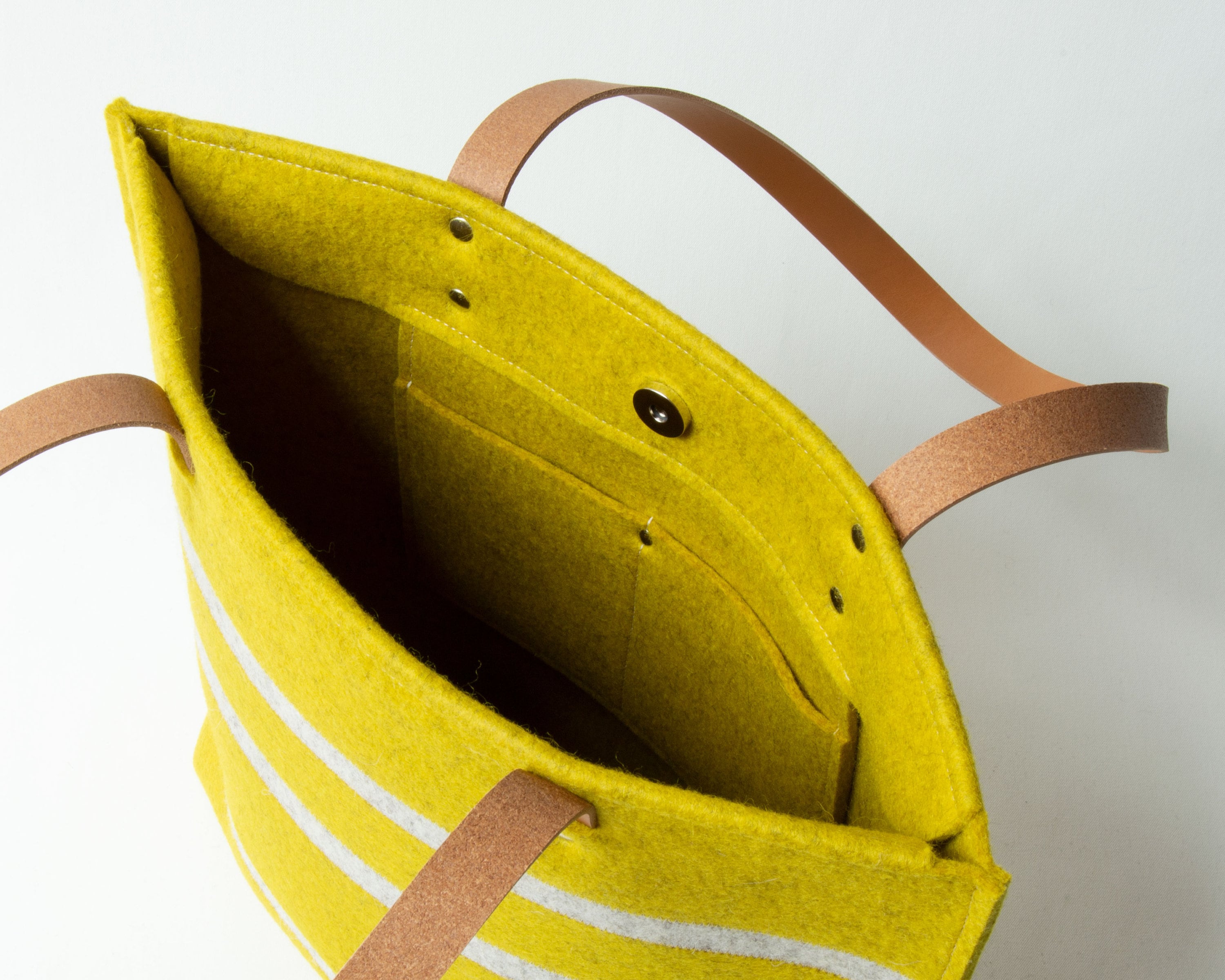 Introducing our gorgeous Striped Tote Bag with leather straps in a trendy mustard and oatmeal color combination. This bag is carefully crafted in every detail, with the finest leather straps and convenient internal pockets for all your essentials. Handmade in Italy with 100% wool felt, this bag not only looks luxurious but is durable and long-lasting as well.