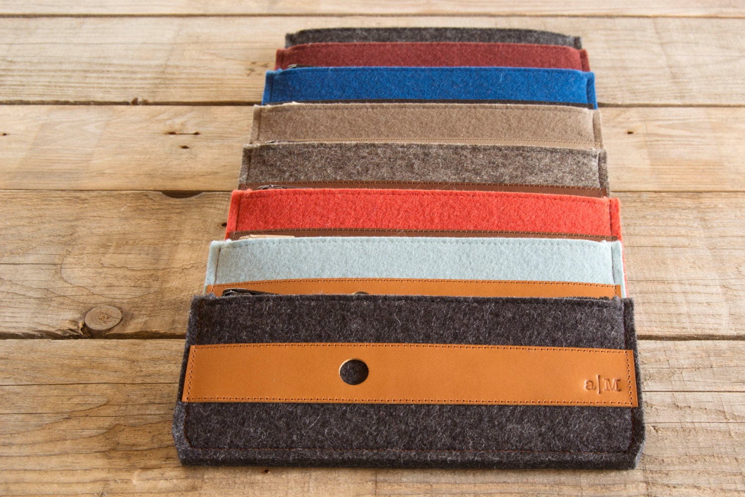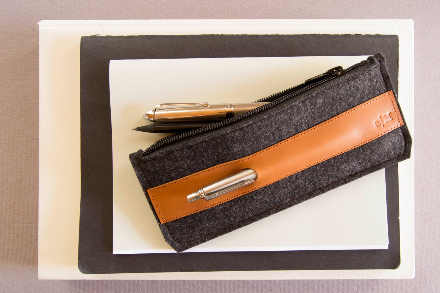 This slim and compact case is perfect for carrying your pens and pencils everyday! It's made of 100% wool felt and vegetable tanned leather, and closes safely using a zipper. Ideal to store pens and pencils, cosmetics or art supplies... and whatever you want.