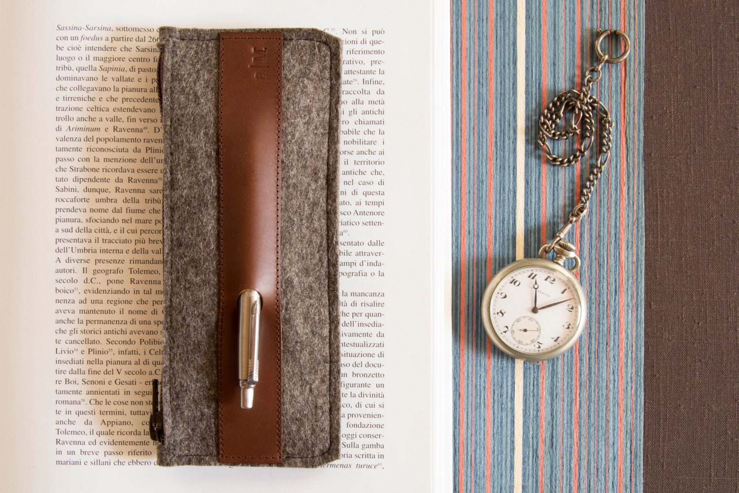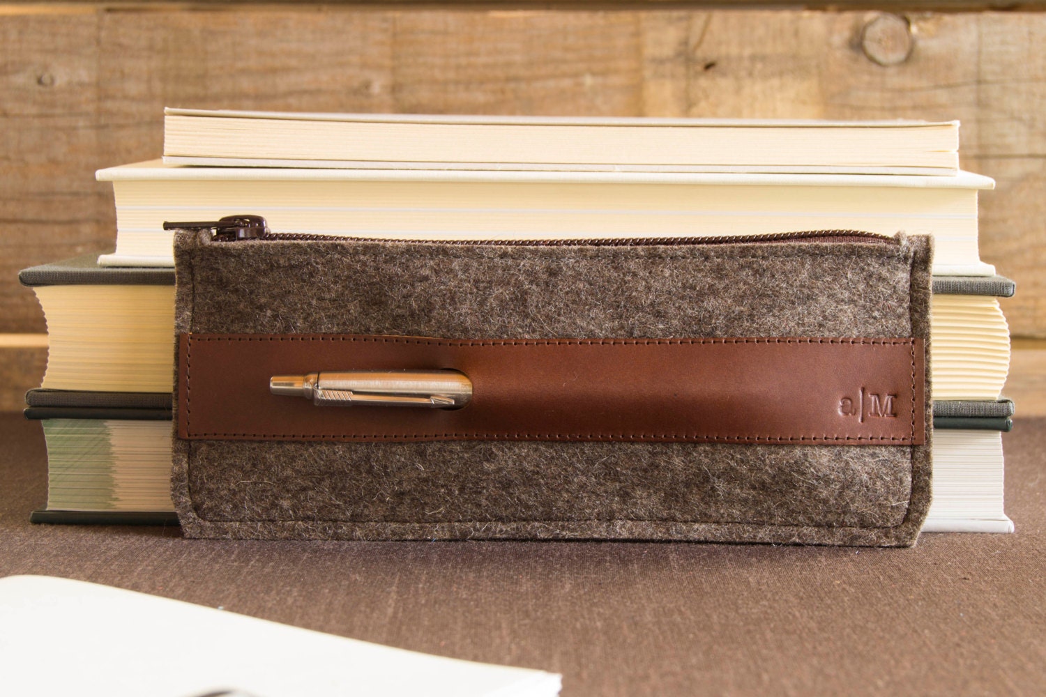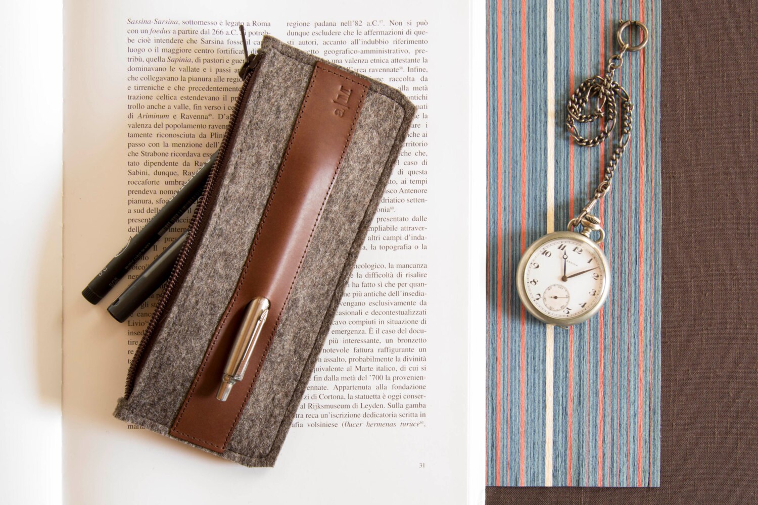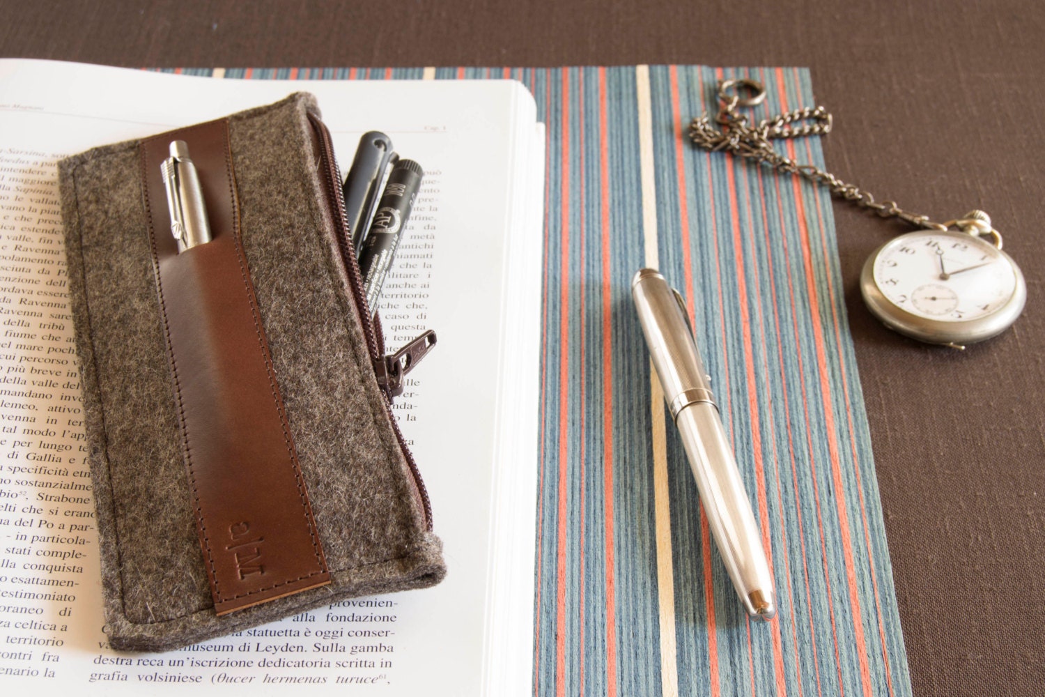 This slim and compact case is perfect for carrying your pens and pencils everyday! It's made of 100% wool felt and vegetable tanned leather, and closes safely using a zipper. Ideal to store pens and pencils, cosmetics or art supplies... and whatever you want.