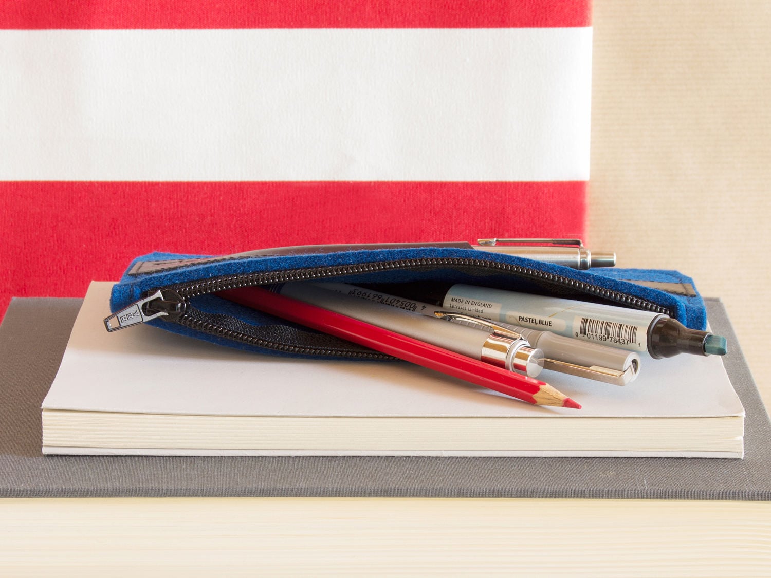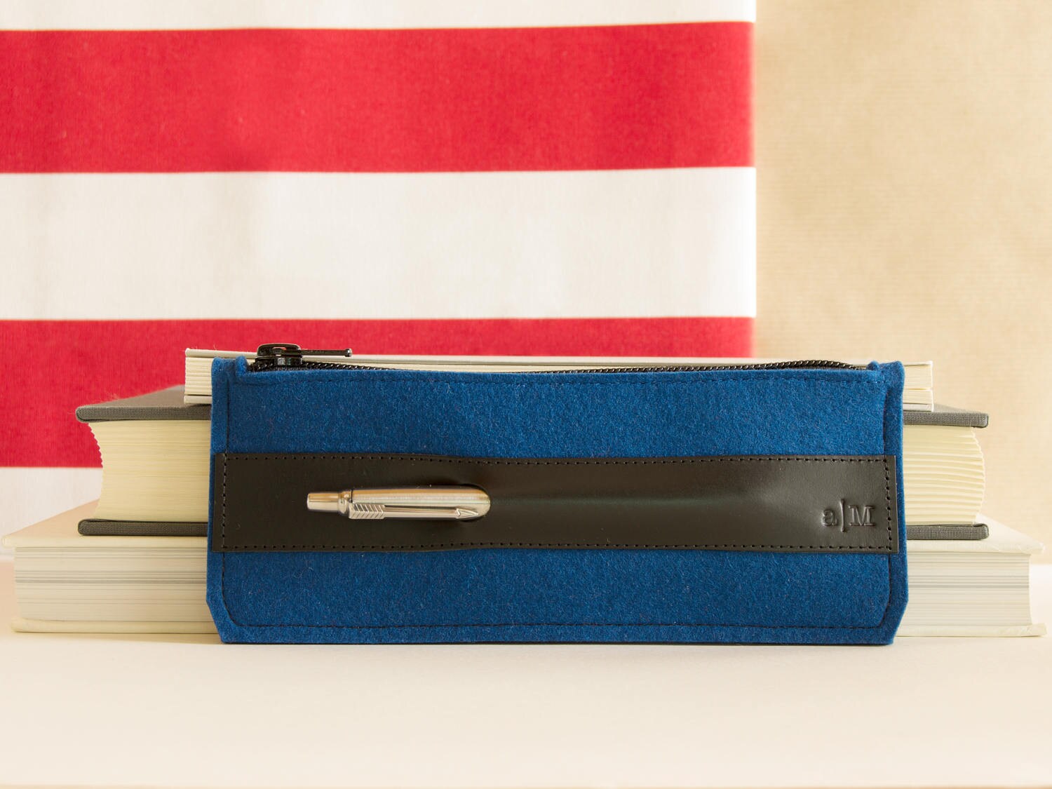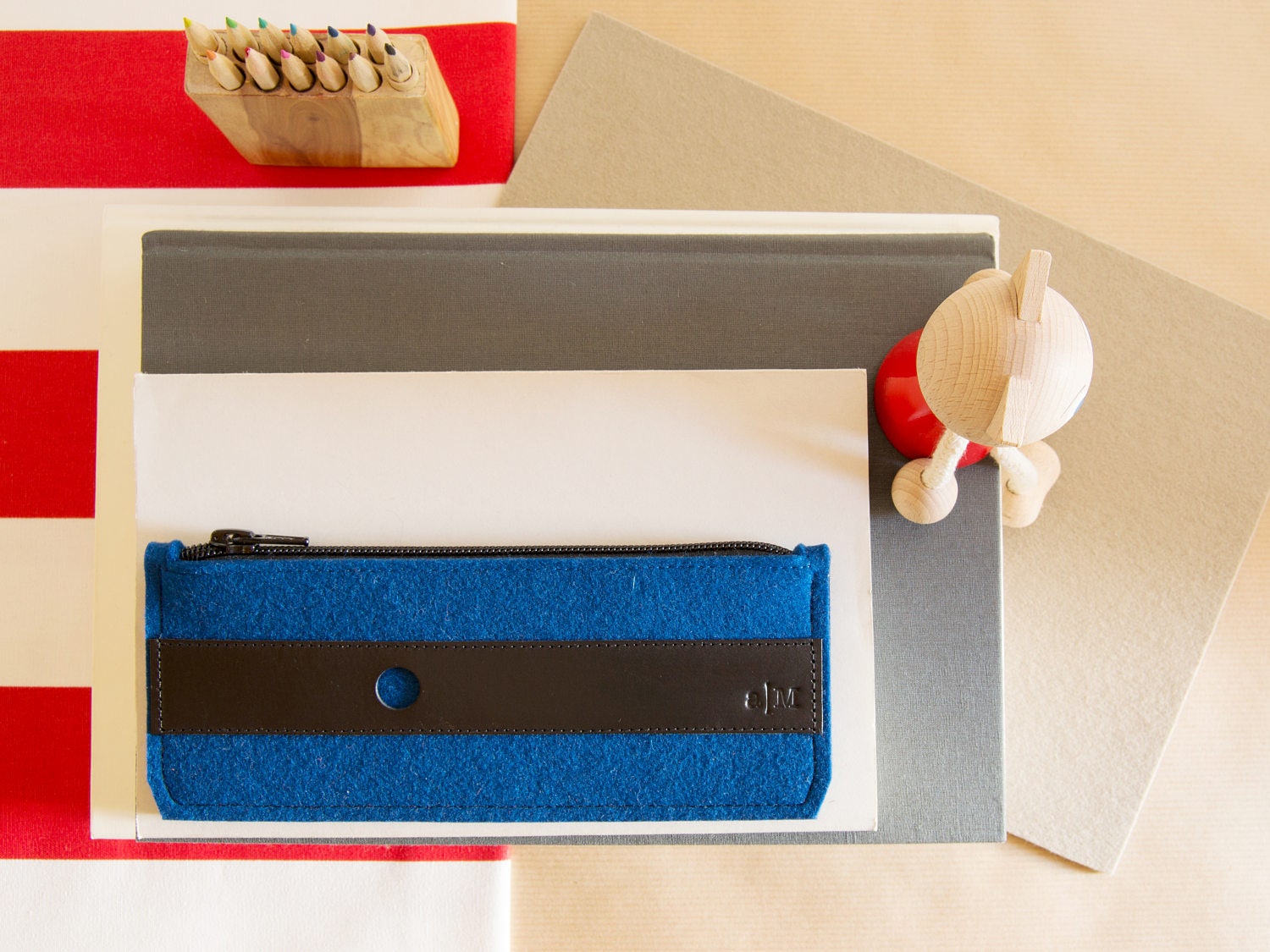 This slim and compact case is perfect for carrying your pens and pencils everyday! It's made of 100% wool felt and vegetable tanned leather, and closes safely using a zipper. Ideal to store pens and pencils, cosmetics or art supplies... and whatever you want.