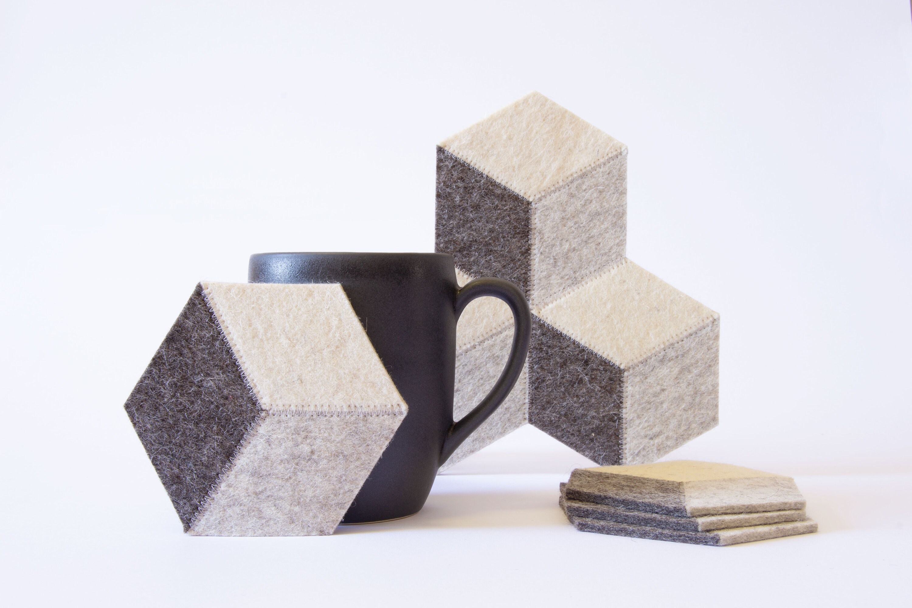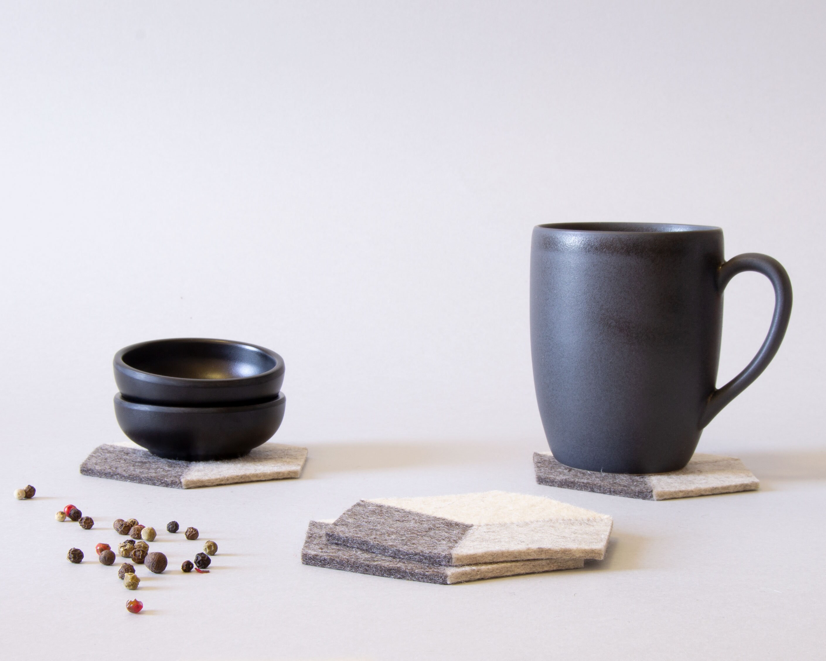 Protect your furniture in style with this set of felt coasters! They are made of 100% wool felt and have a minimalist and eye-catching design. You can add the trivet for your teapot or decanter. Completely handcut and handmade.