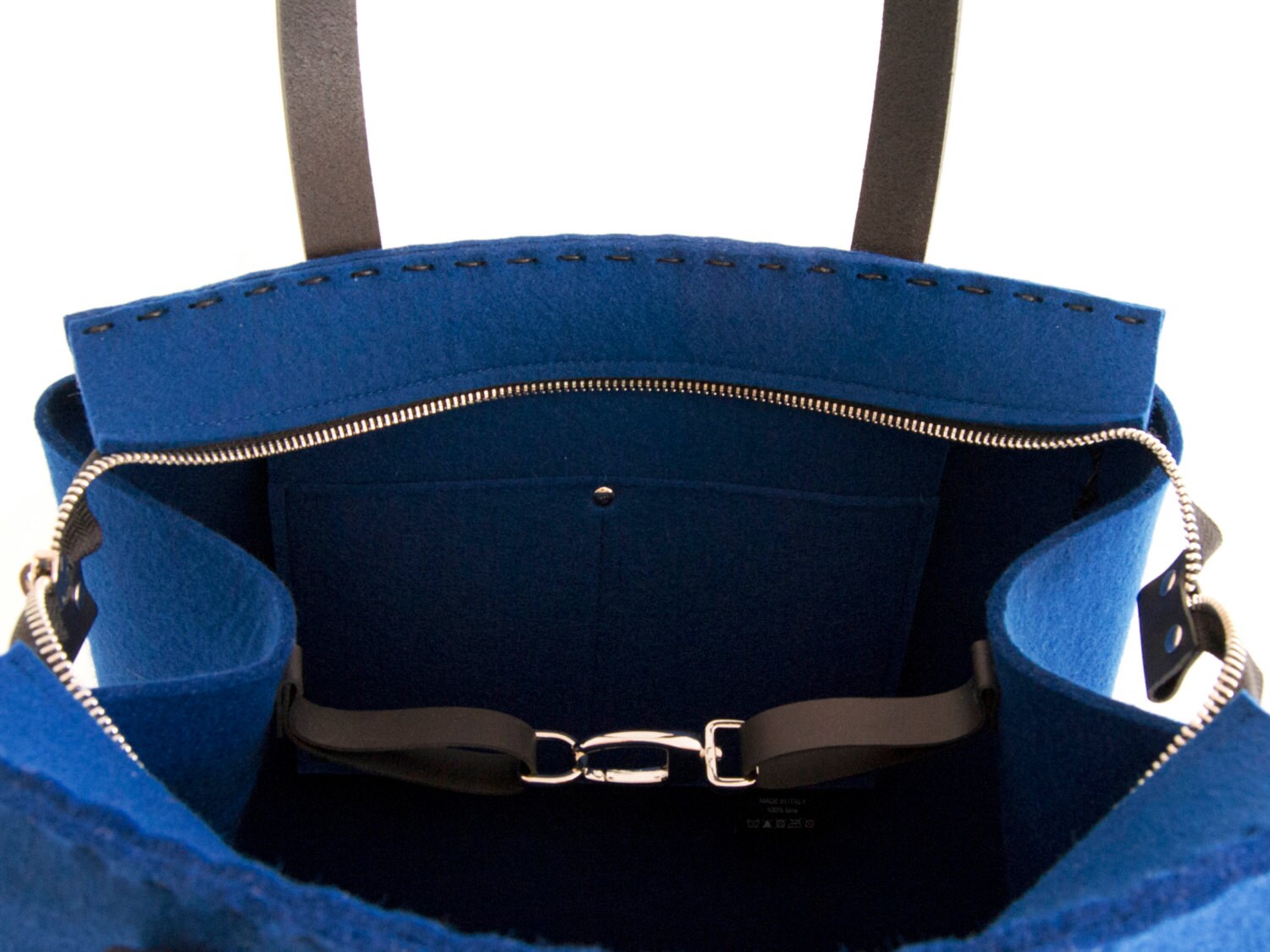 This spacious and elegant bag is designed to carry all of your essentials while keeping you stylish and organized. With a functional zipper closure and an internal carabiner to keep the sides closed, you can trust that your belongings will stay secure. The black stitching is completely handmade using a premium leather cord, adding a touch of luxury to the bag. Made of 100% merino wool felt, this bag is soft and durable, making it the perfect everyday companion for any woman.