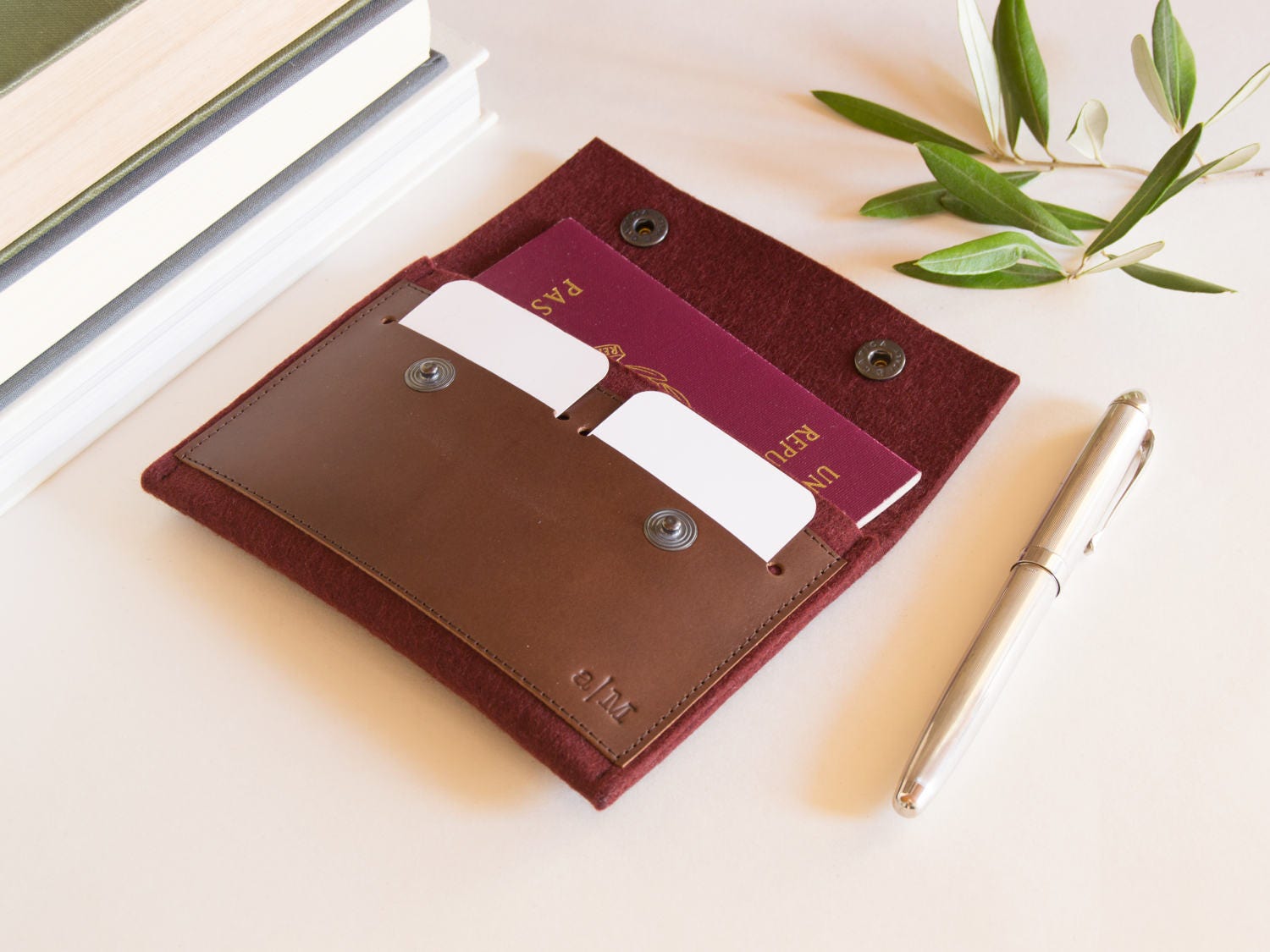 Travel in style! With this felt and leather wallet you can securely carry your passport, credit cards, and documents.