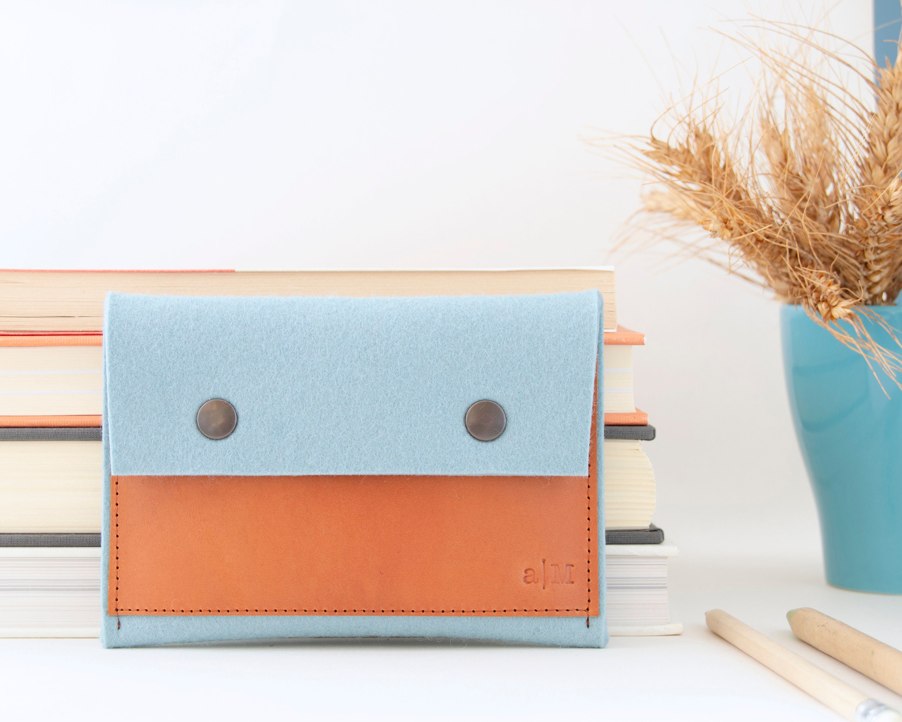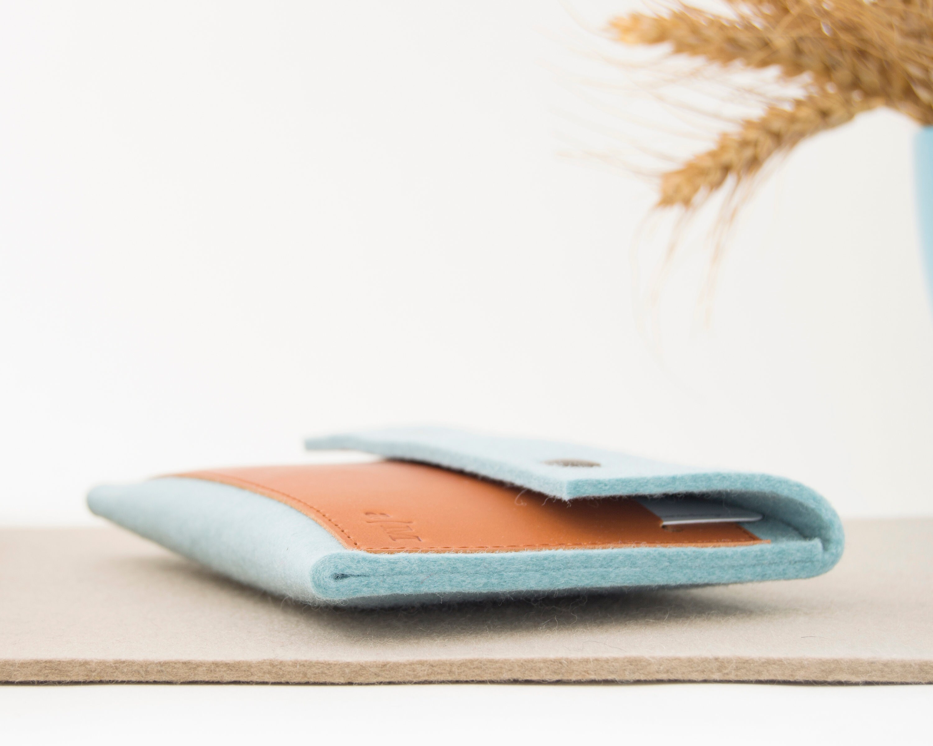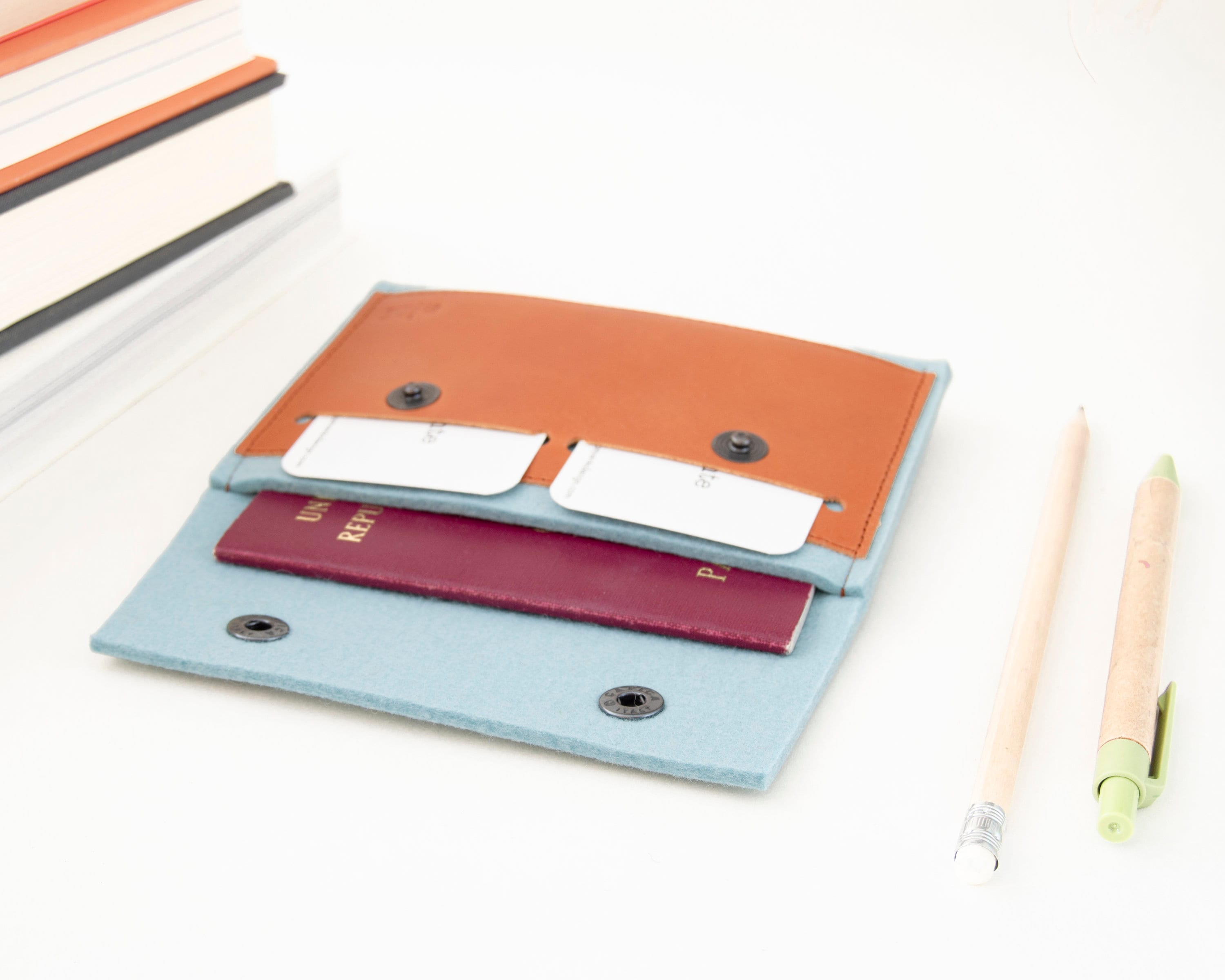 Travel in style! With this felt and leather wallet you can securely carry your passport, credit cards, and documents.