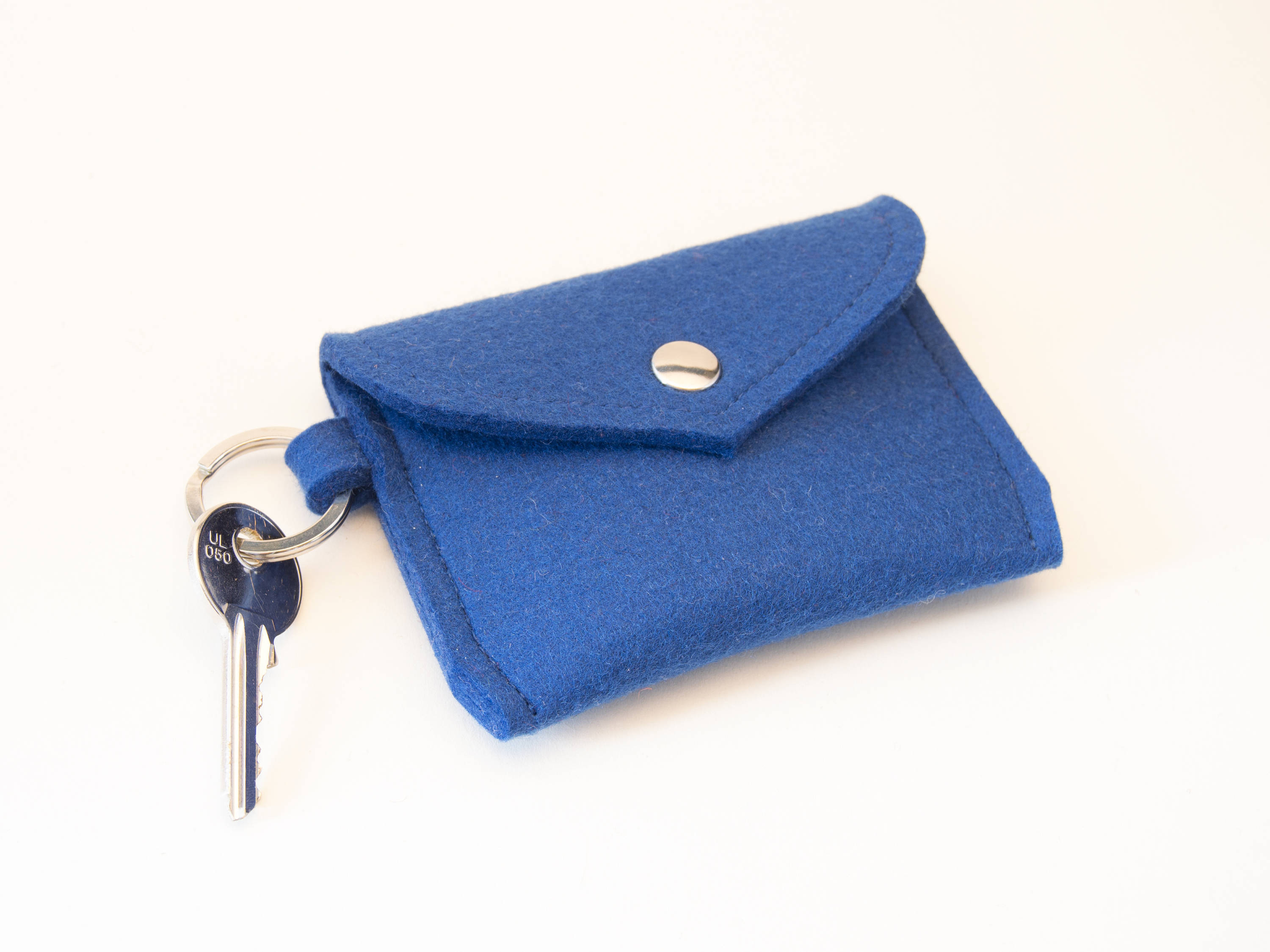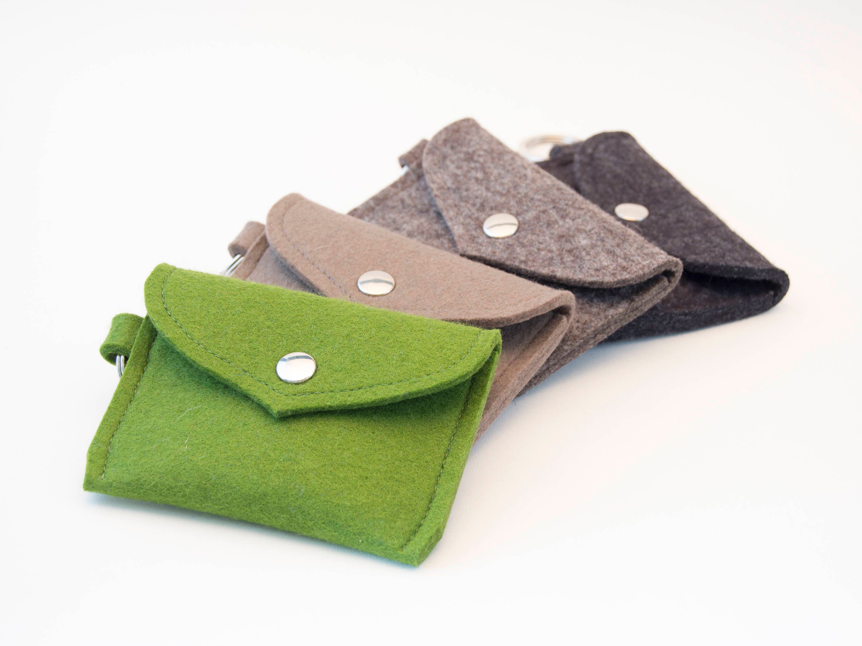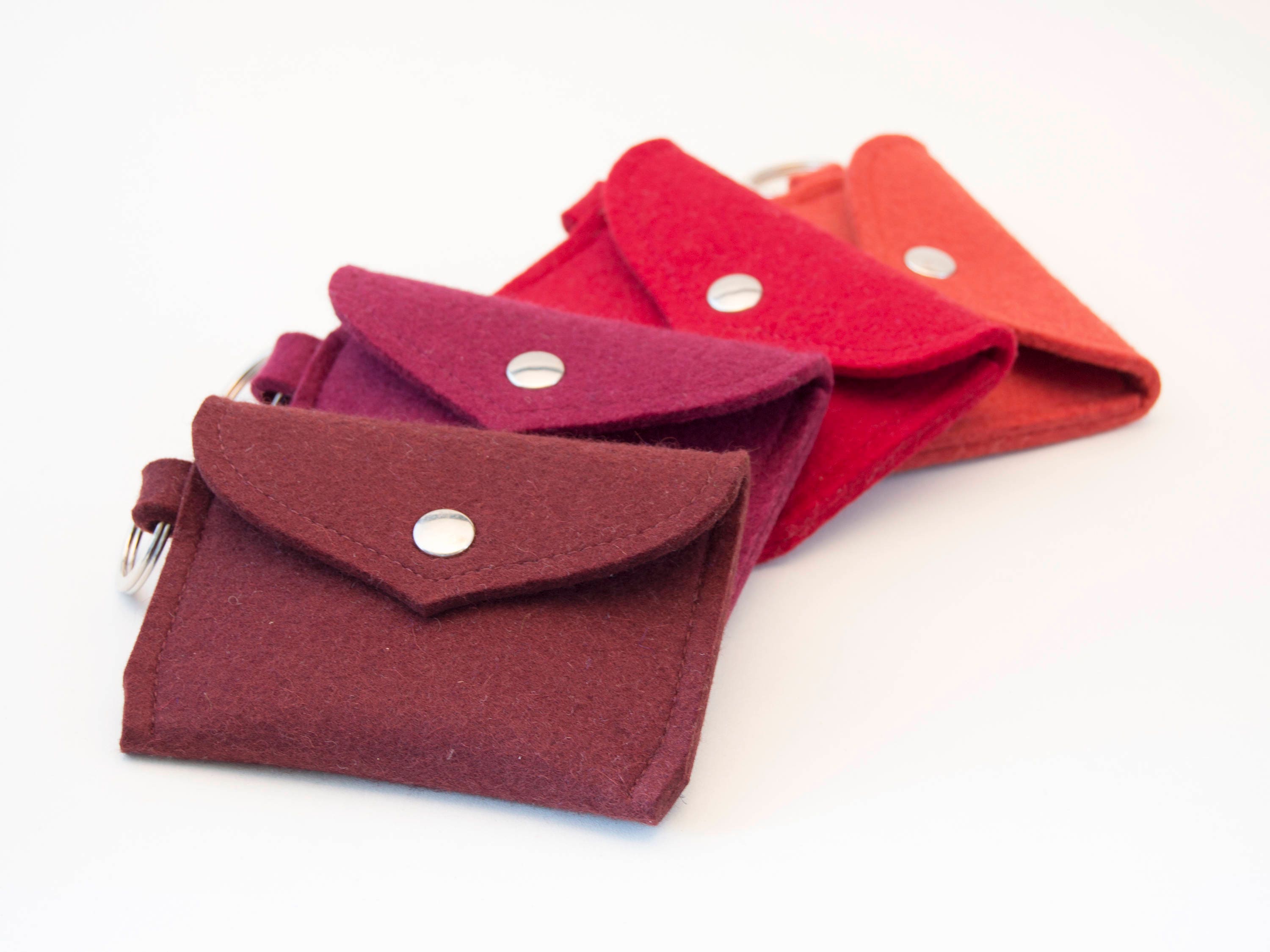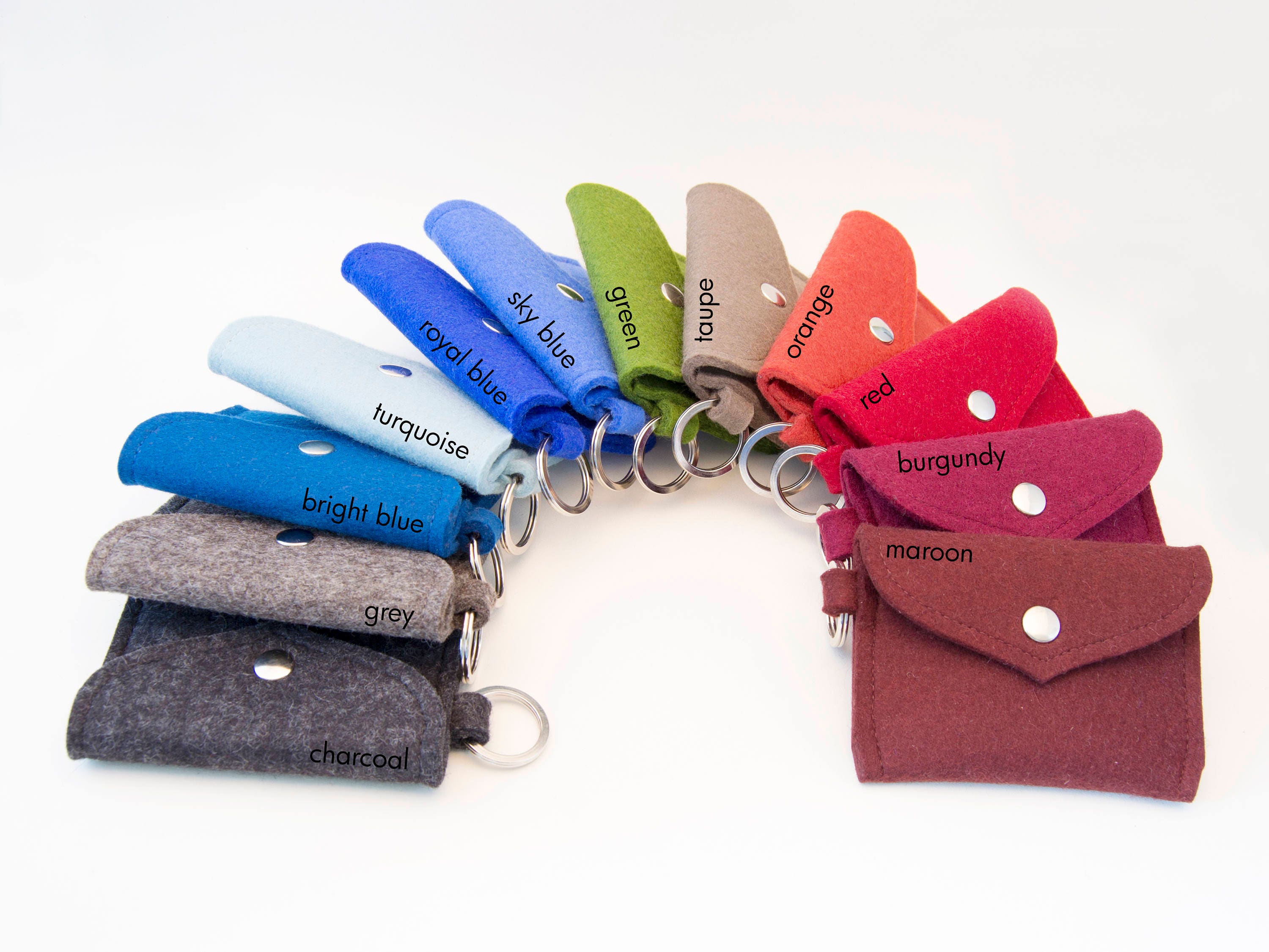 This Wool felt PURSE is perfect for holding your cards, money and coin. It cames with a key ring making it a perfect accessory for a coffee run or anytime you don't want to take your bag.