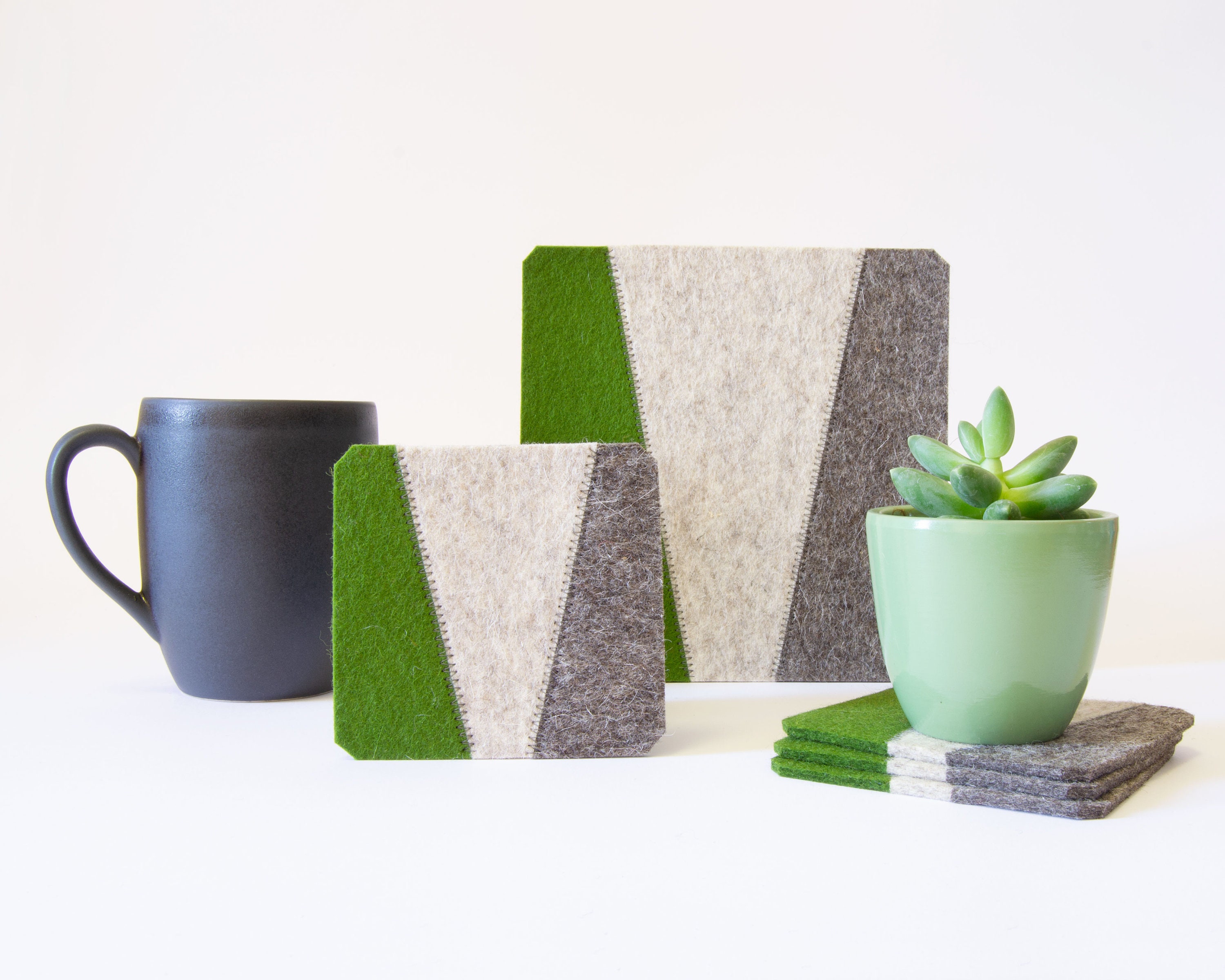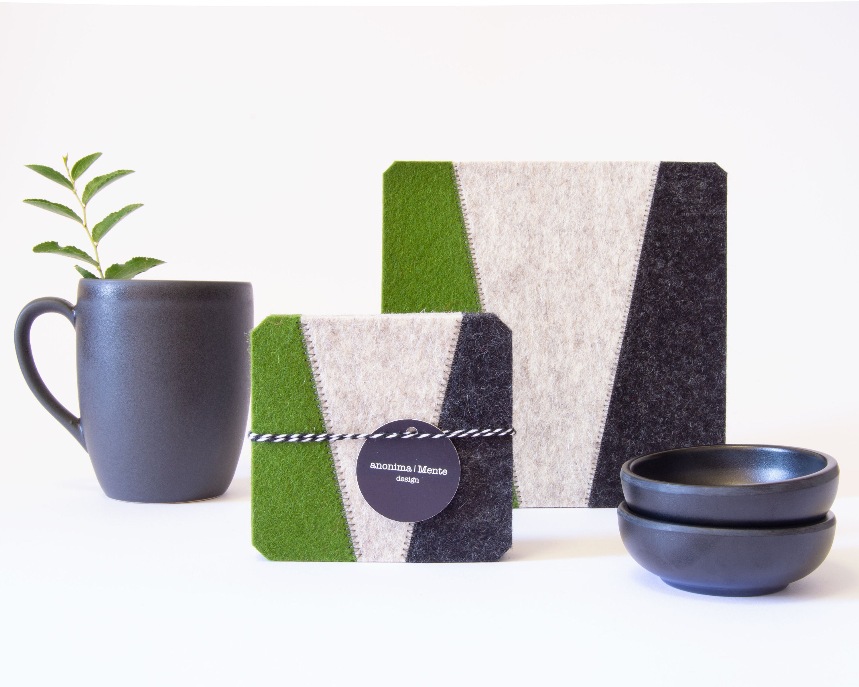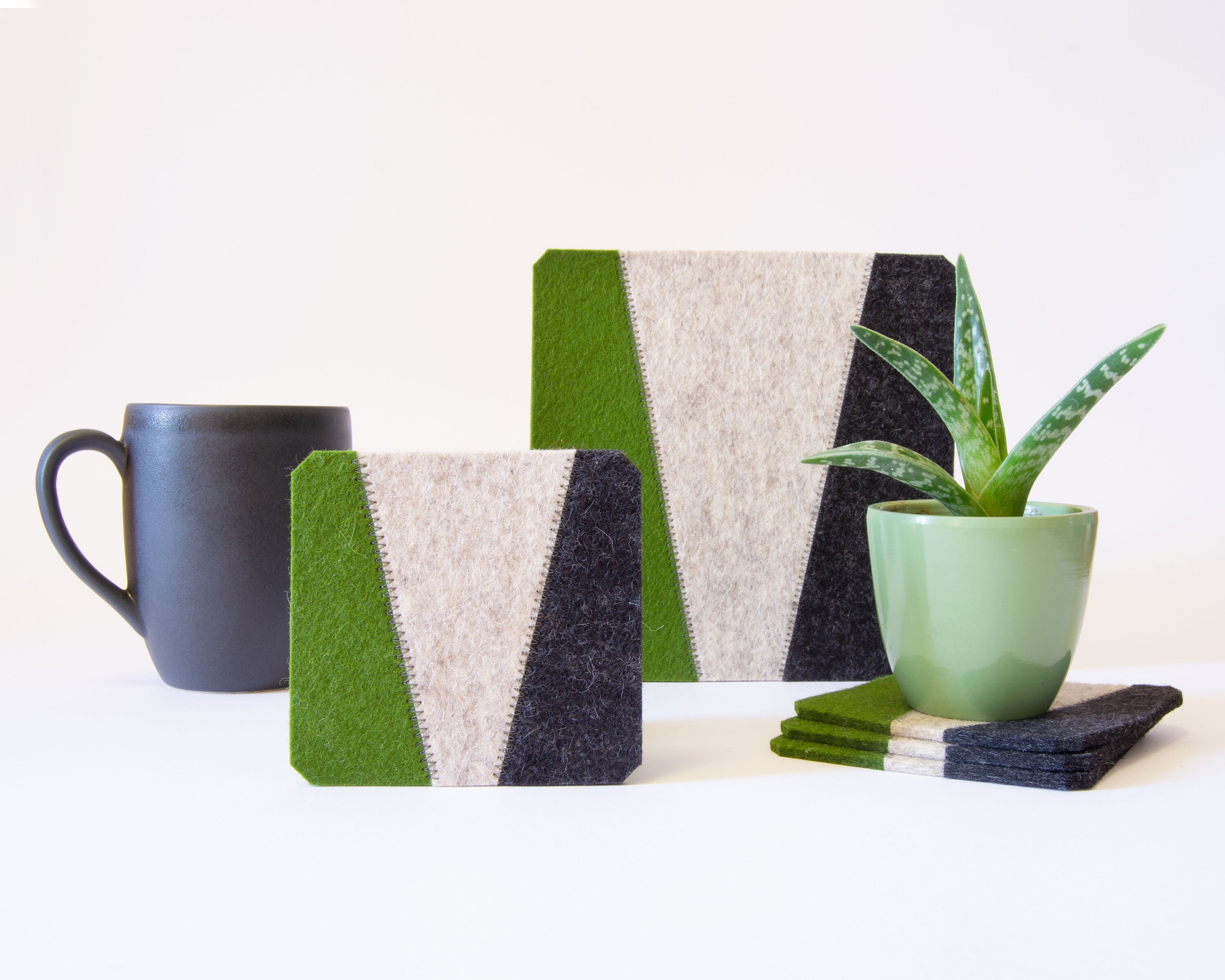 Protect your furniture in style with this set of felt coasters! They are made of 100% wool felt and have a minimalist and eye-catching design. You can add the trivet for your teapot or decanter.