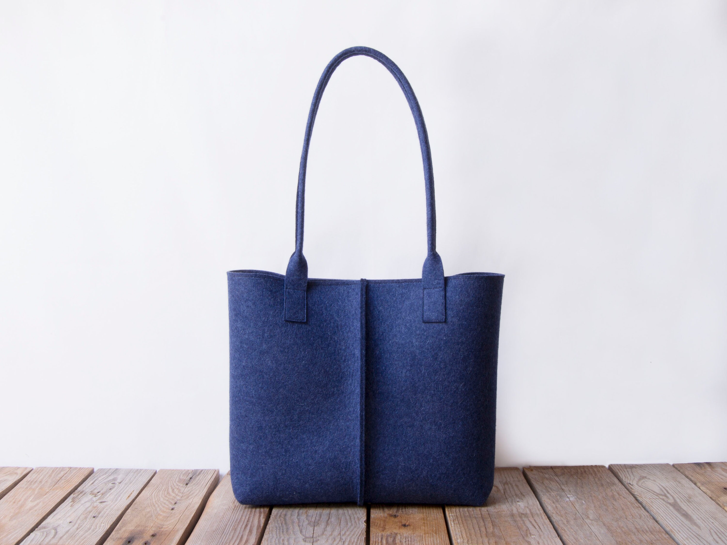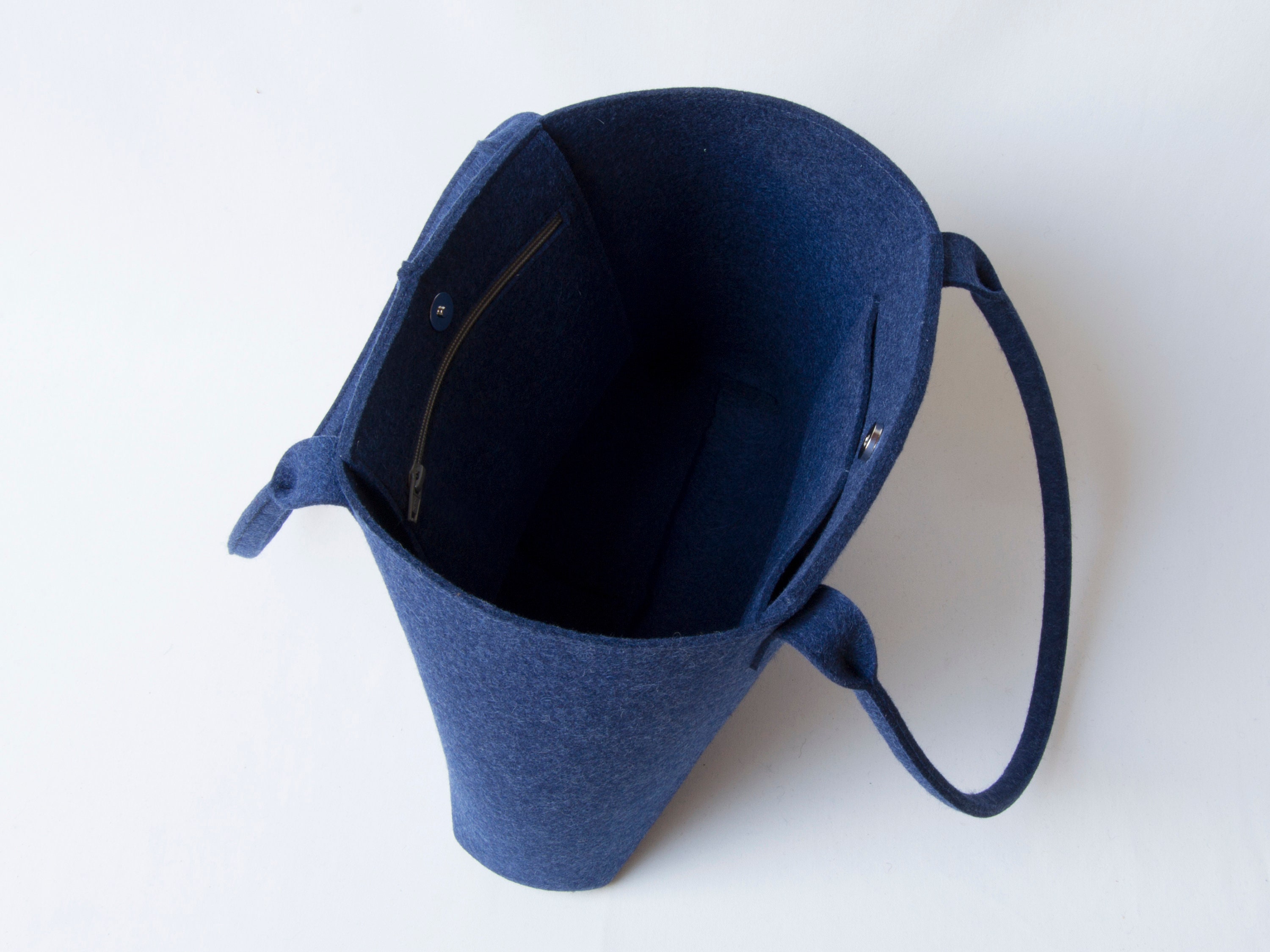 Introducing our timeless design Wool Felt TOTE BAG in a beautiful shade of blue. This versatile bag can easily be paired with more formal outfits or casual jeans and a t-shirt. Handcrafted in Italy using 100% wool felt, this bag is not only lightweight and spacious but also incredibly durable. With its classic design and high-quality materials, this bag is perfect for any woman on-the-go looking for a stylish and reliable accessory.