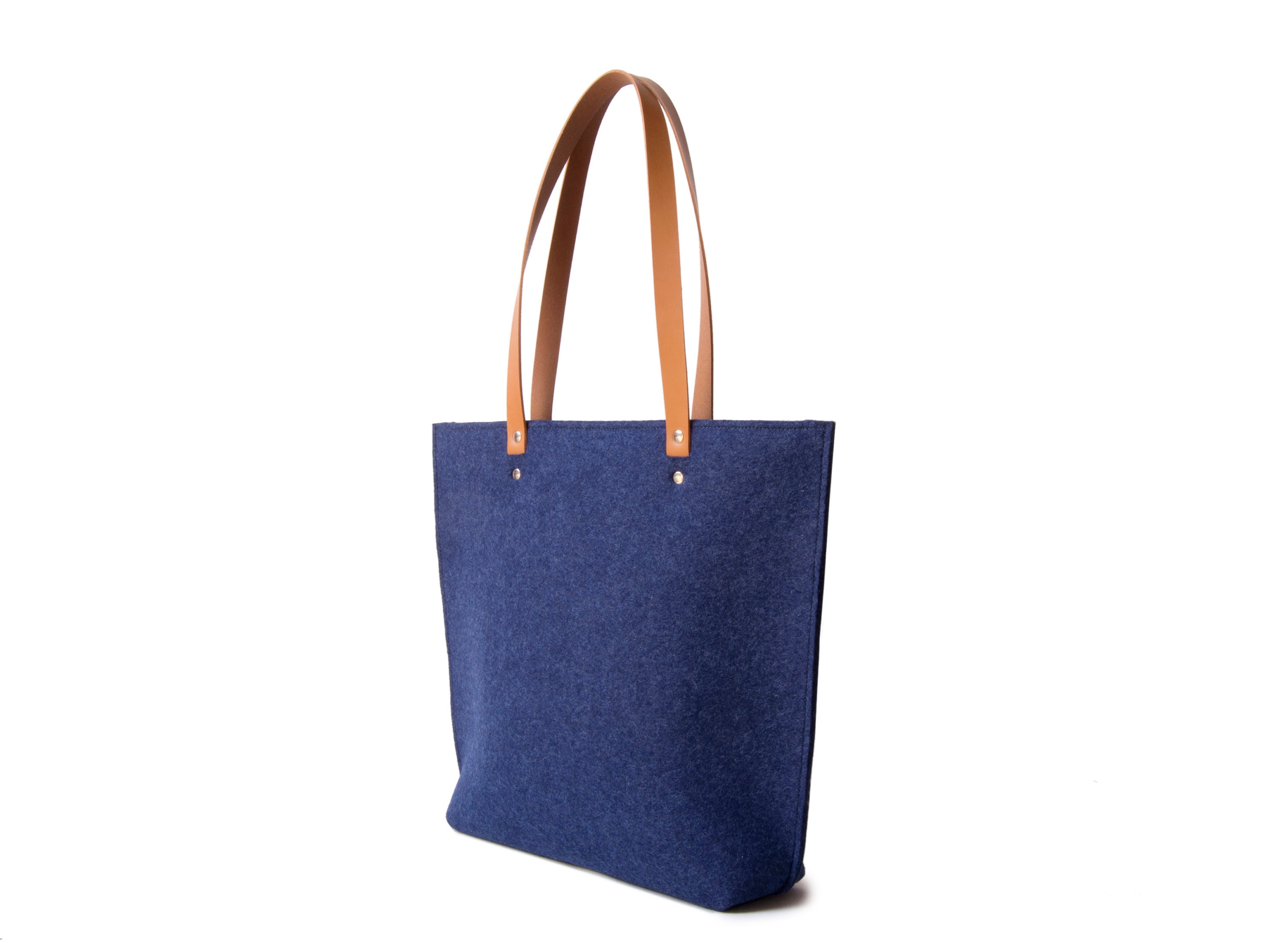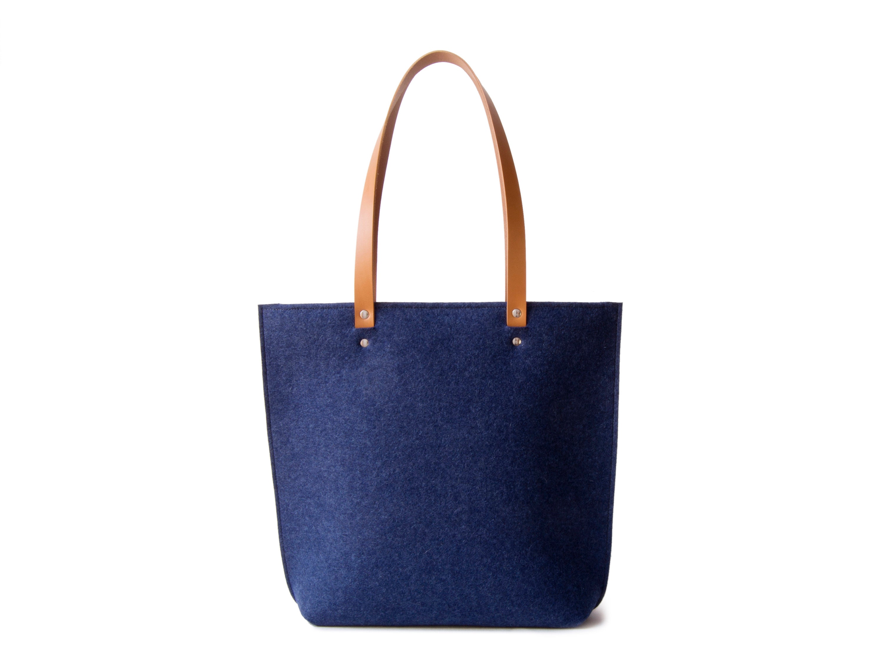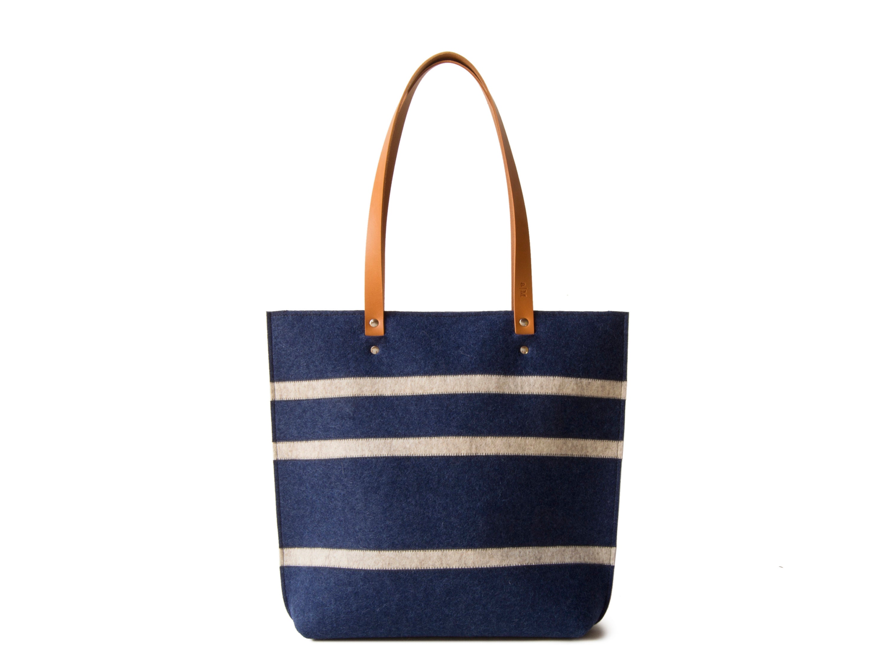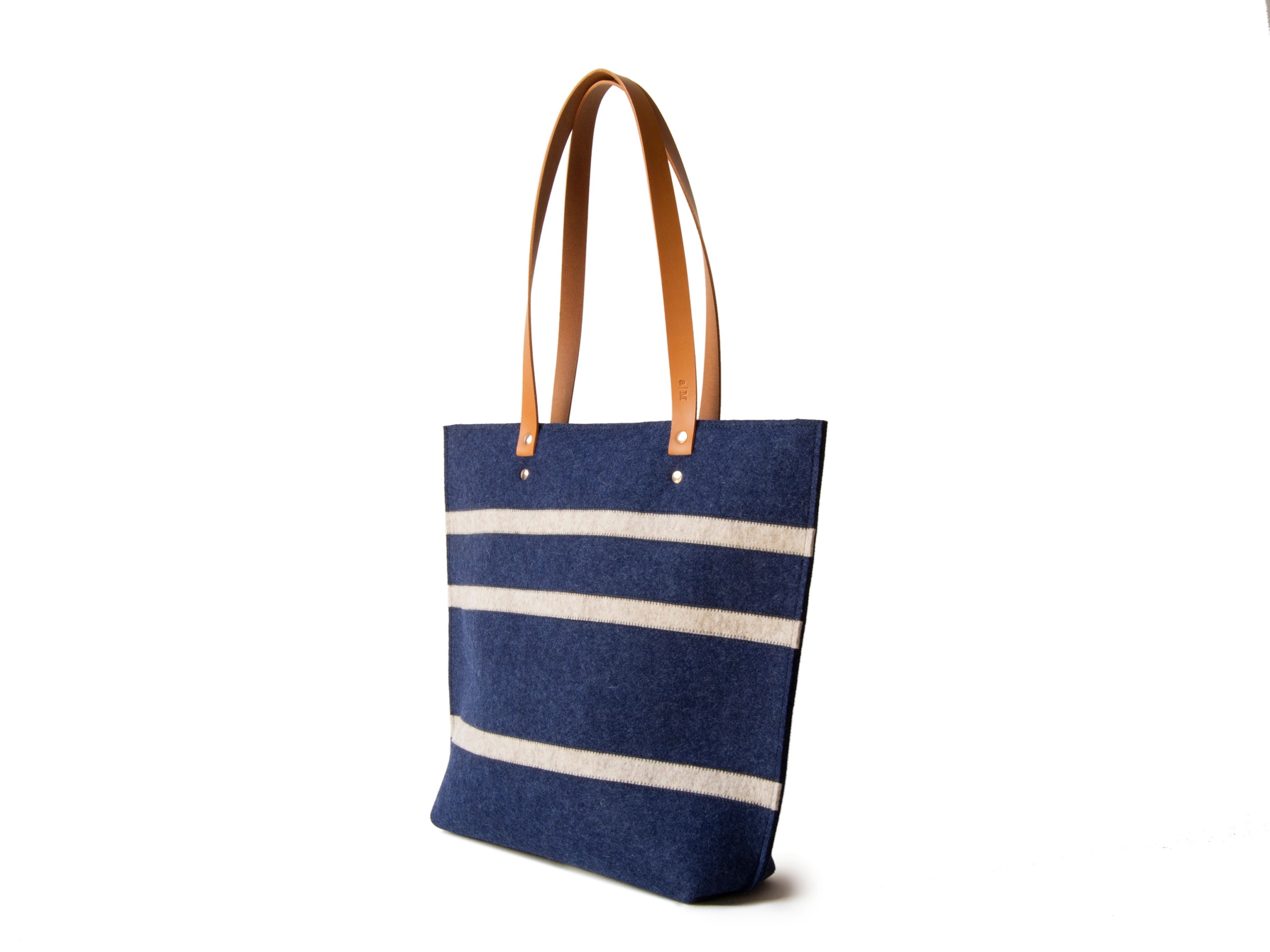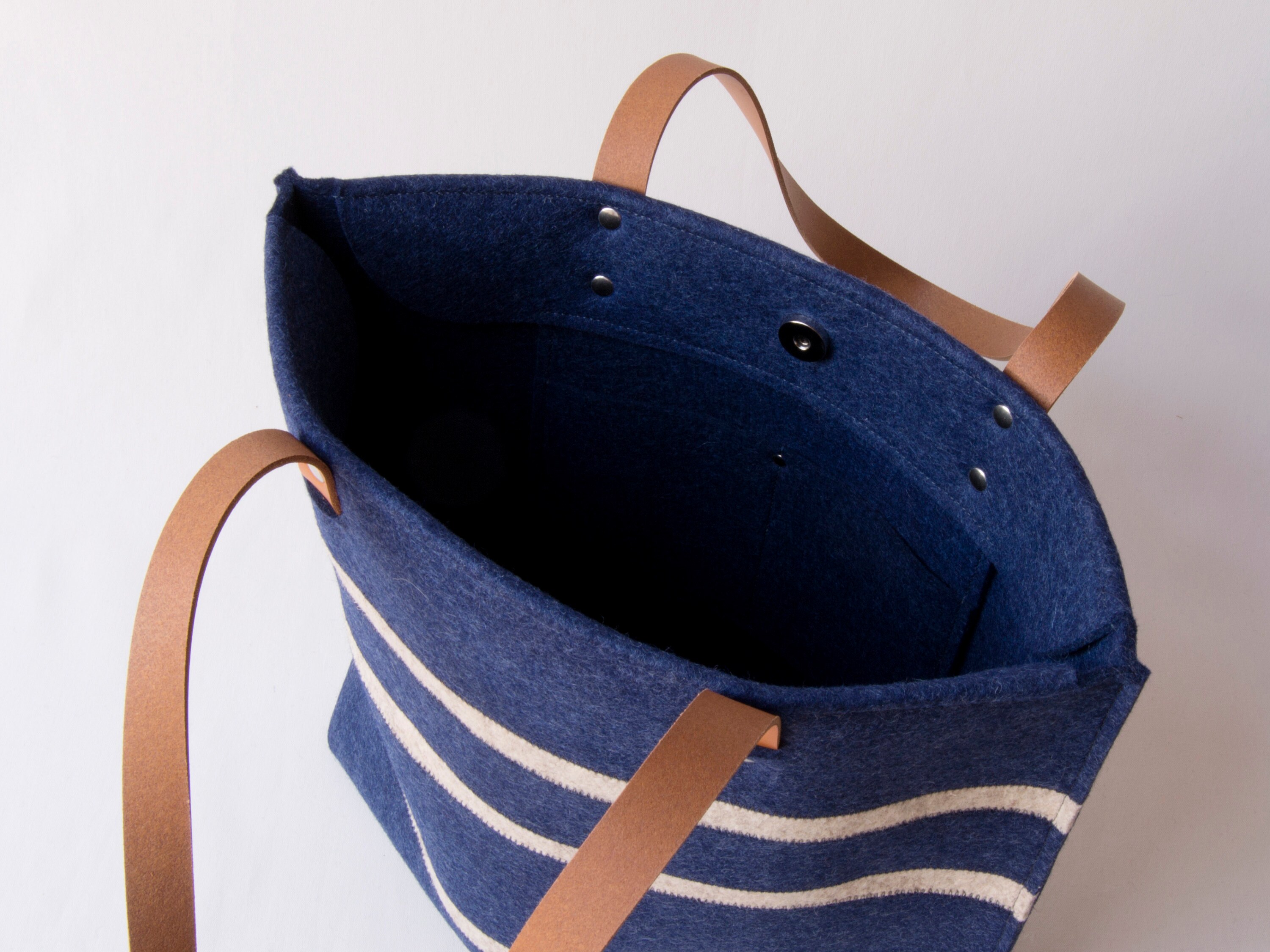 Introducing our gorgeous Striped Tote Bag with leather straps in a stylish blue and oatmeal color combination. This bag is carefully crafted in every detail, with the finest leather straps and convenient internal pockets for all your essentials. Handmade in Italy with 100% wool felt, this bag not only looks luxurious but is durable and long-lasting as well.